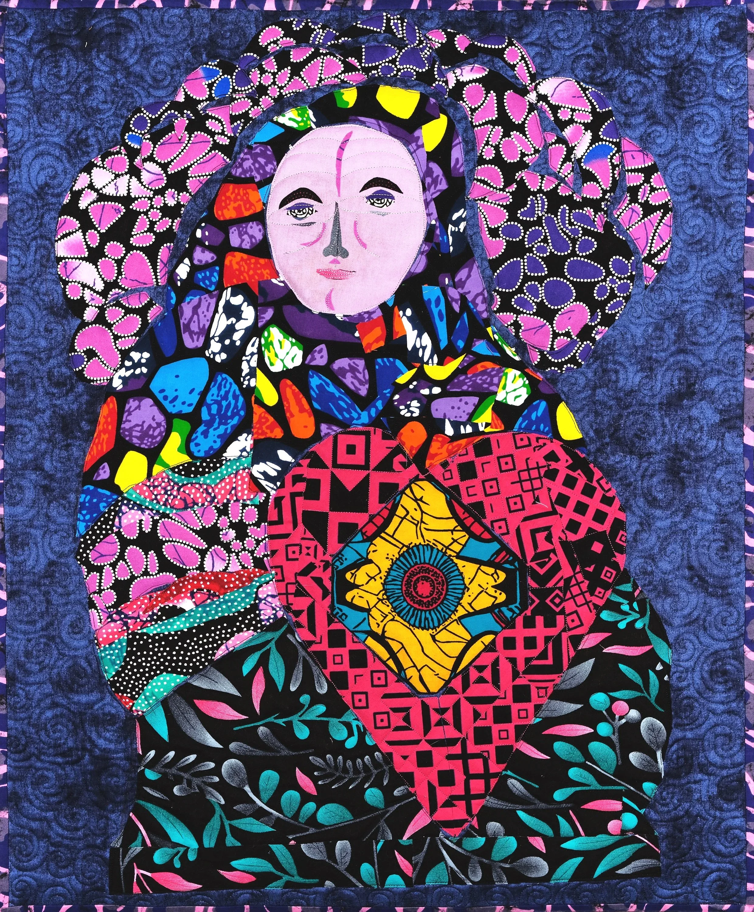 This quilt is another improvised piece, suggesting a human form. An outline of the image was drawn freehand on fabric, then pieces of fabric were selected and fused onto that surface. The end result was quilted by machine, hand finished.
